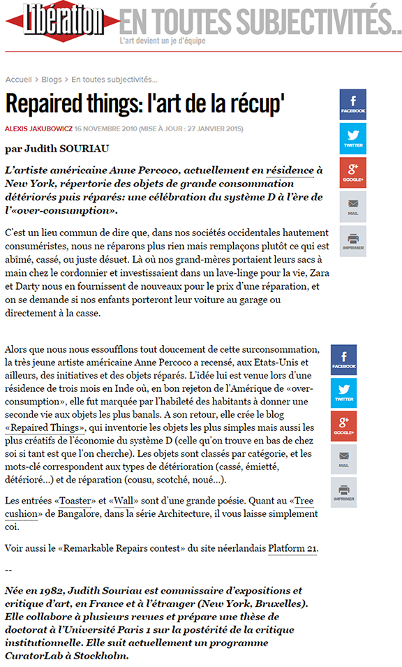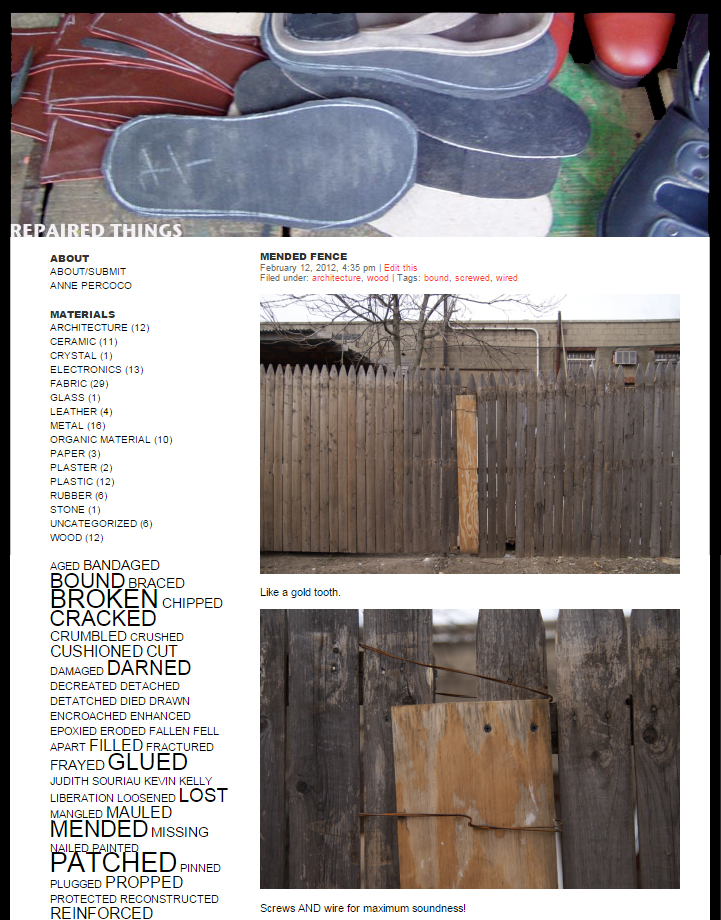 This is a blog documenting repairs by myself and others. In this way, I am investigating how value is created and lost, how function can be enhanced or subverted, and how repurposed objects can shift from one role to another. Submit photos of your own repairs to repairedthings@gmail.com.