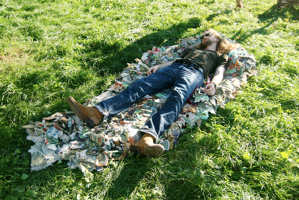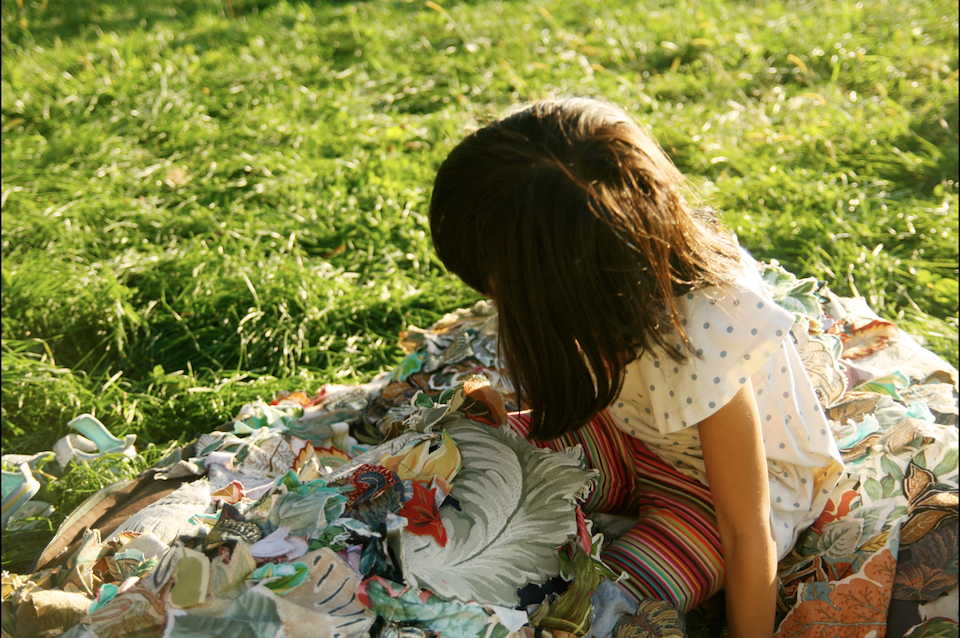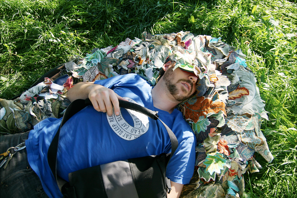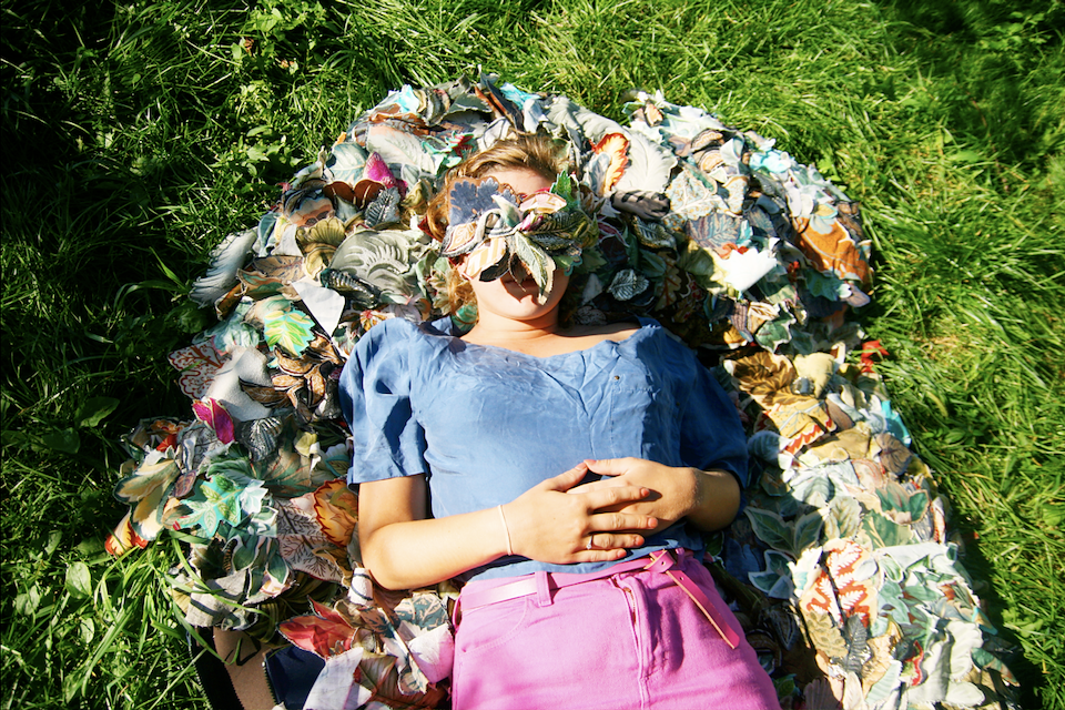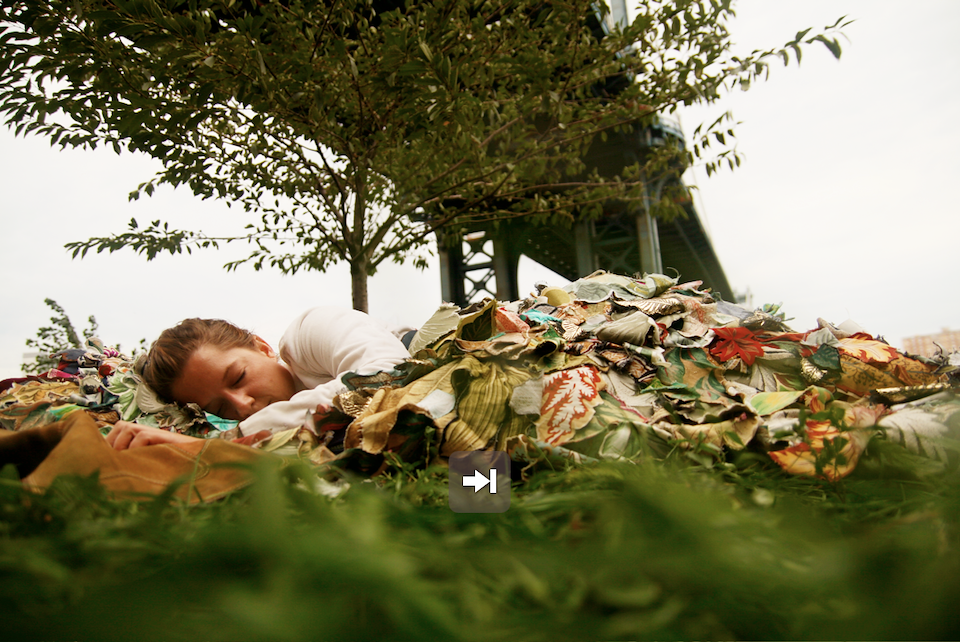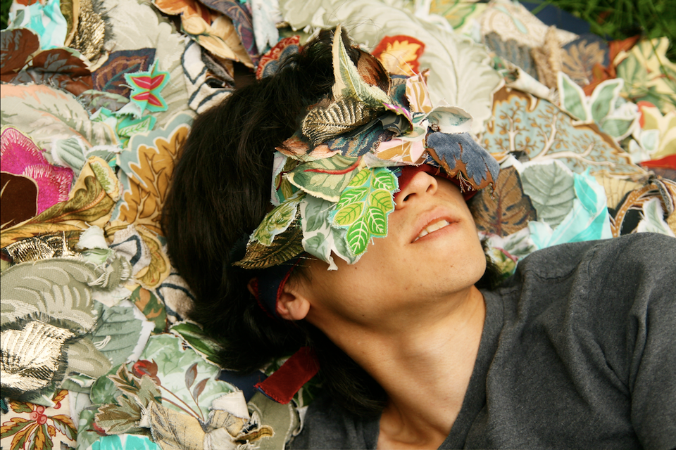 BROOKLYN, NEW YORK. For the 2010 Dumbo Arts Festival, I created a functional sleeping bag and pillow sewn out of cloth leaves culled from botanical-print fabrics. These leaves vary in material, color, graphic style, and texture. From a distance, the sleeping bag appears to be a messy, beautiful pile of leaves.