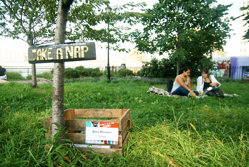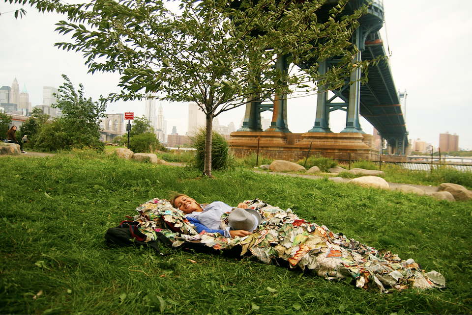 I invited people to nap in the sleeping bag in the Brooklyn Bridge Park. In this way, participants activated the sculpture. They had the opportunity to rest, camouflaged, in the midst of the festival’s activity.