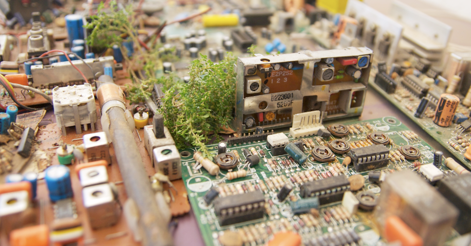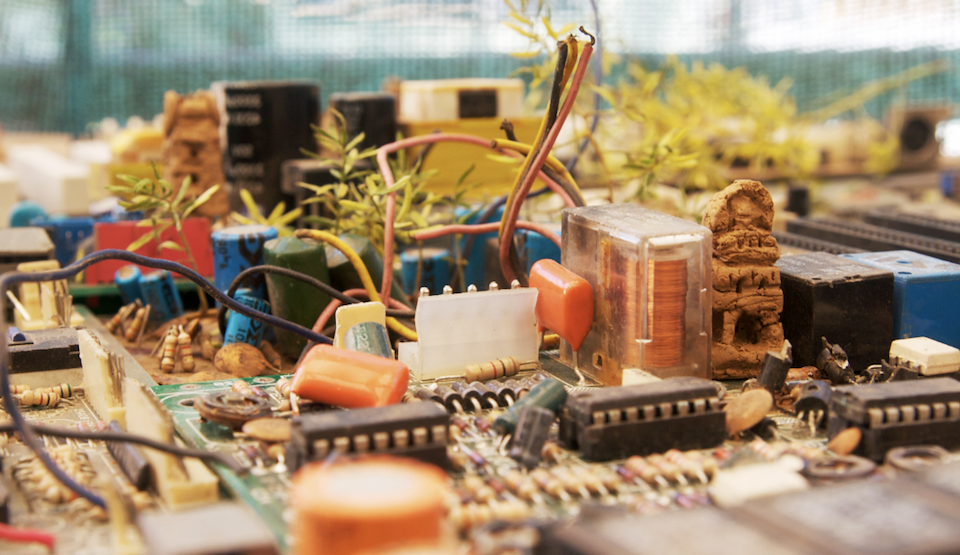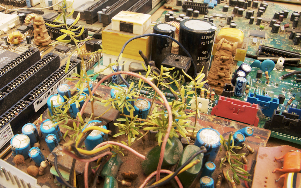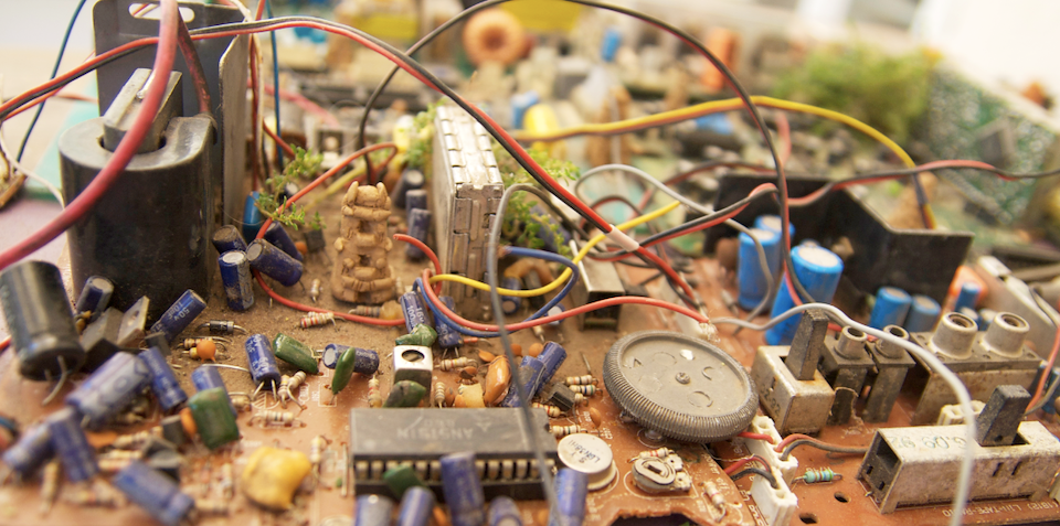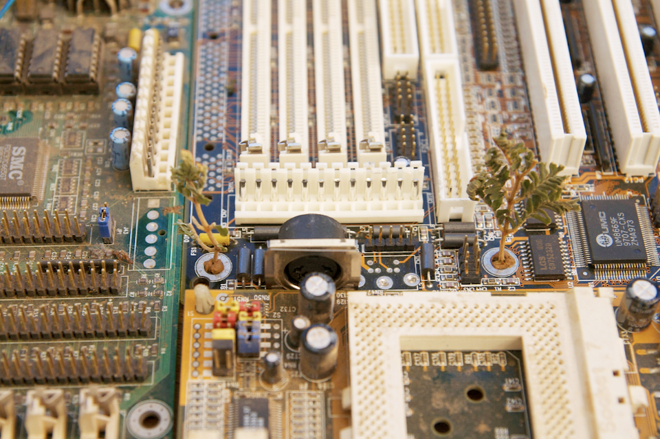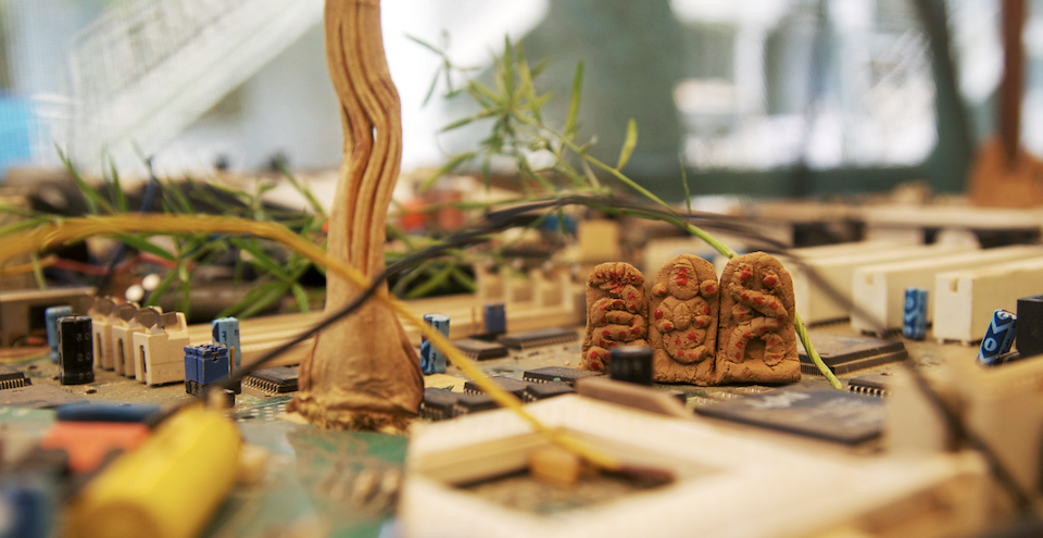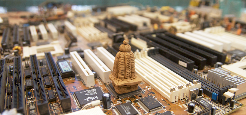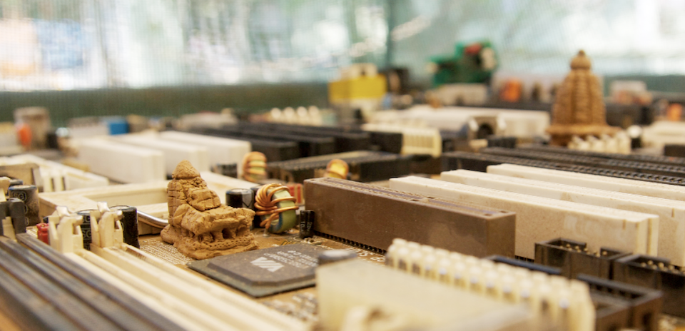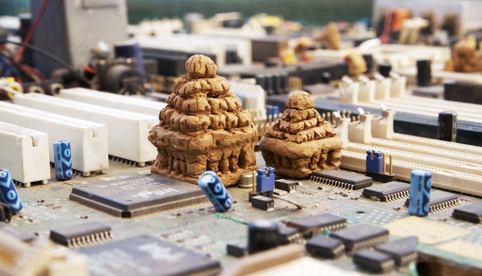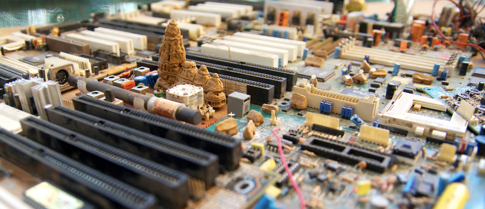 The Cityscape photographs juxtapose religious and functionalist architecture, natural and technological elements, history and future. Urban temples act as spatial reference points: physical landmarks for cultural and historical narratives. Hundreds or thousands of years old, these temples contrast with modern architecture, which seems to exist outside of time, box-like and shiny as spaceships. The technology represented by these motherboards has already changed the way we experience space: As more actions occur within virtual space, physical space is de-emphasized, and as more efficient means of travel and communication shrink distances, I imagine our sense of place changing on a global scale.