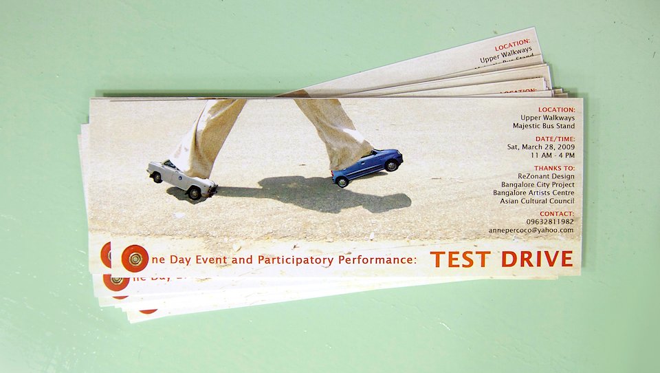 If Cityscapes are representational and Walking Sutra is presentational, then Test Drive directs the viewer out of the gallery and into direct experience of the city. During this participatory performance, users traveled as a pedestrian-cum-automobile, a driver-cumvehicle, a machine-cum-body against the background of Bangalore’s main transportation hub. Moving at a greater speed than a pedestrian and a lesser speed than a car or motorcycle, they negotiated their own space and path within existing traffic patterns. Here, each participant articulated his or her own narrative thread: a creative process involving split second decisions, weighing of priorities, and personal preference. More playful than functional, these journeys provided an opportunity for non-linear uses of city-space as well as reflect on the changes in city planning and infrastructure to accommodate the increase in private vehicles.