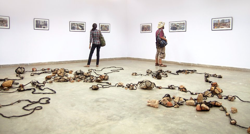 The floor installation, Walking Sutra, is a material documentation of my travel through the city. The word “sutra” is used both in the sense of a thread as well as that of a moral story. The form of the sculpture is sequential, recalling a walk as a series of recovered artifacts, like steps or stitches. De Certeau writes of footsteps: “Their intertwined paths give their shape to spaces. They weave places together.” The rocks and chunks of concrete are words in what he calls “the long poem of walking”, also like prayer beads on a mala. The rope, made from hair, reminds one of the human protagonist of this story.
