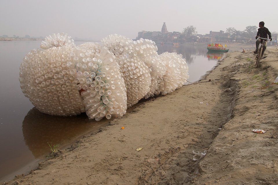 VRINDAVAN, INDIA – Working with the local N.G.O. Friends of Vrindavan, I created a mobile public sculpture out of plastic water bottles which brought to life a local myth about water resources and drew attention to the severely polluted condition of the Yamuna River.