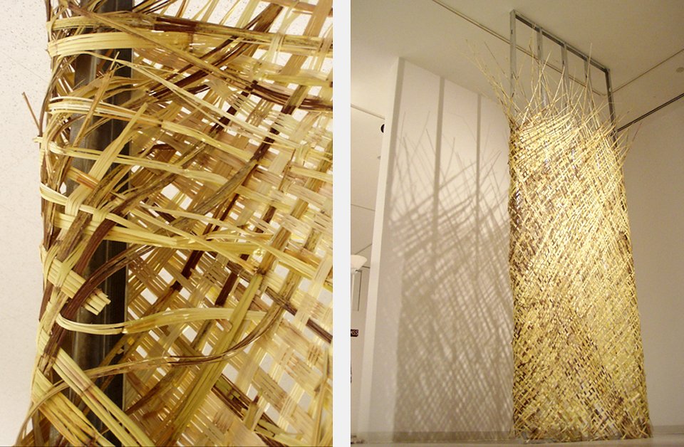 This sculpture combines traditional craft (handwoven reeds) and modern architectural materials (aluminum wall studs). The towering structure, extending from floor to ceiling, begins unraveling towards the top.
