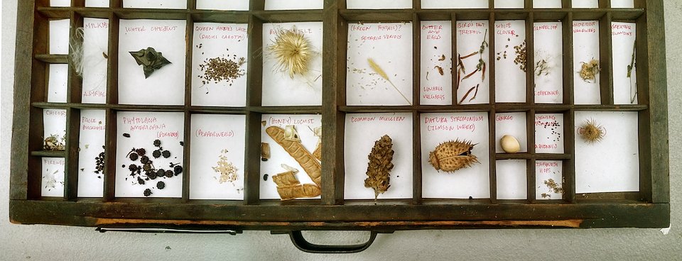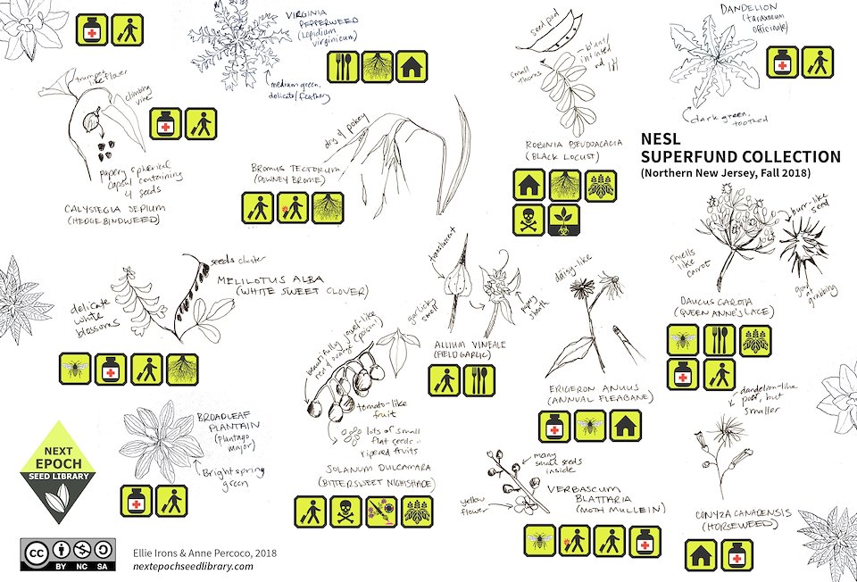 The Next Epoch Seed Library (NESL) is an artist-run seed saving project focused on the novel, spontaneous, and adaptable plants known as weeds. Founded in 2015 by Ellie Irons and Anne Percoco, the project focuses on collecting, storing and sharing seeds from these plants, which tend to live in close association with dense human populations. Our collection sites include areas heavily impacted by human activity, such as vacant lots, street verges, superfund sites and abandoned infrastructure. Through presentations, workshops, seed-swaps and exhibitions, NESL encourages viewers and participants to engage with their local habitat and reflect on their own role in the adaptation and success of these plants. Offering services like soil stabilization, moisture retention, heat island reversal, and toxic bioaccumulation, these disturbance-adapted plants help heal wounds inflicted by a changing climate and make neighborhoods more liveable for human and non-human residents alike. This summer, 2023, NESL has a temporary home at the Five Corners Library in Jersey City, NJ.