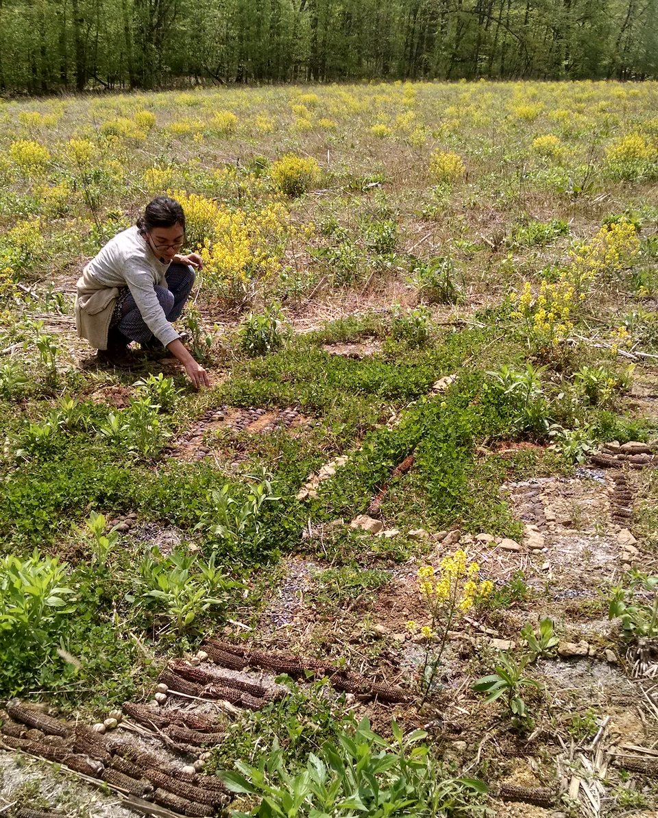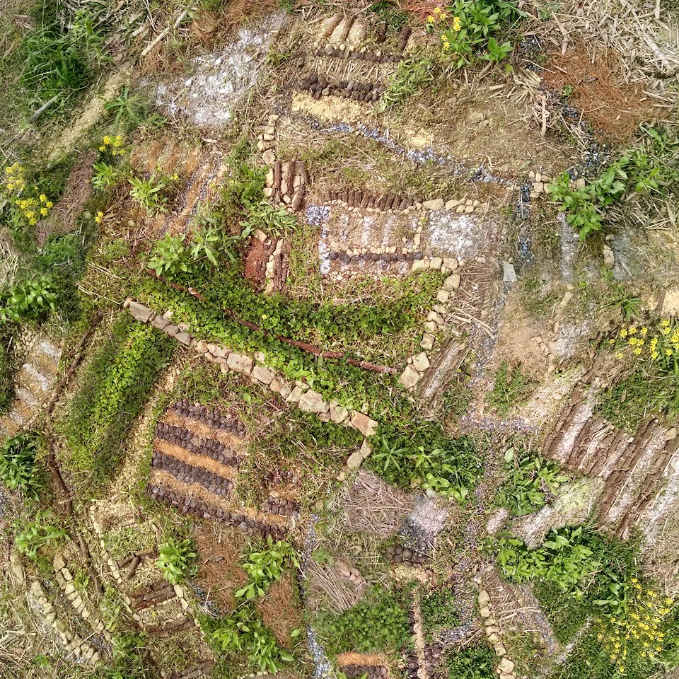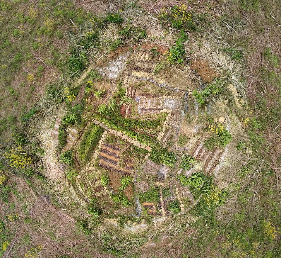 On a fallow cornfield, I created this circular sculpture out of natural and synthetic materials found nearby: dirt, stones, ash, gravel, bits of roof shingles, live clover, dry corn cobs, black walnuts, pine needles, and cut grass.