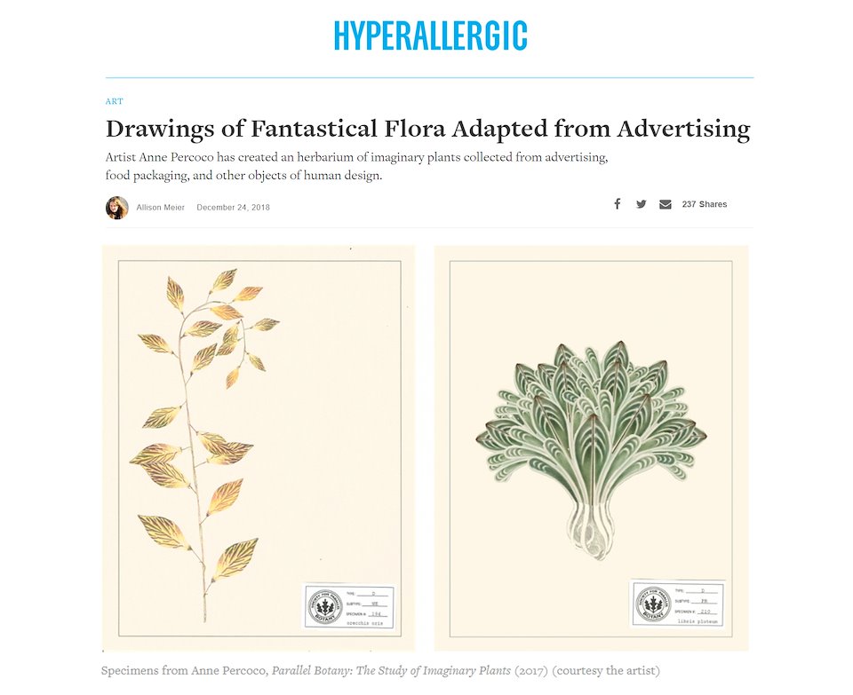 "The result is oddly biodiverse landscape reminiscent of those conjured by Italo Calvino’s stories erring on the magical side of magical realism. Having reappropriated this imagery of nature from commercial products, Percoco effectively removes it from the sterile world of corporate advertising and places it squarely back in the realm of imagination. In so doing, Parallel Botany reveals the possibility of fecundity in the most unlikely of places: the trash heap." -- Lorissa Rinehart, Art and Object