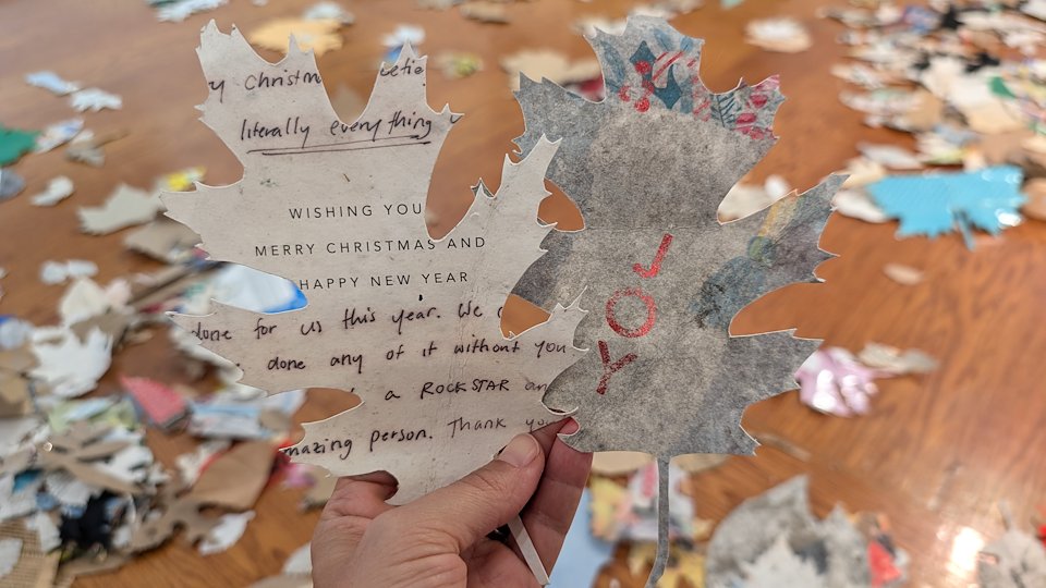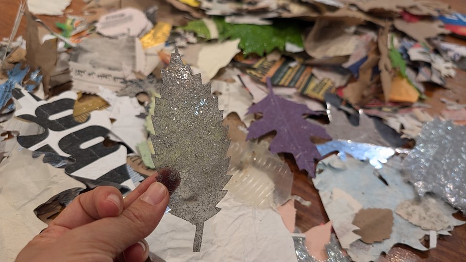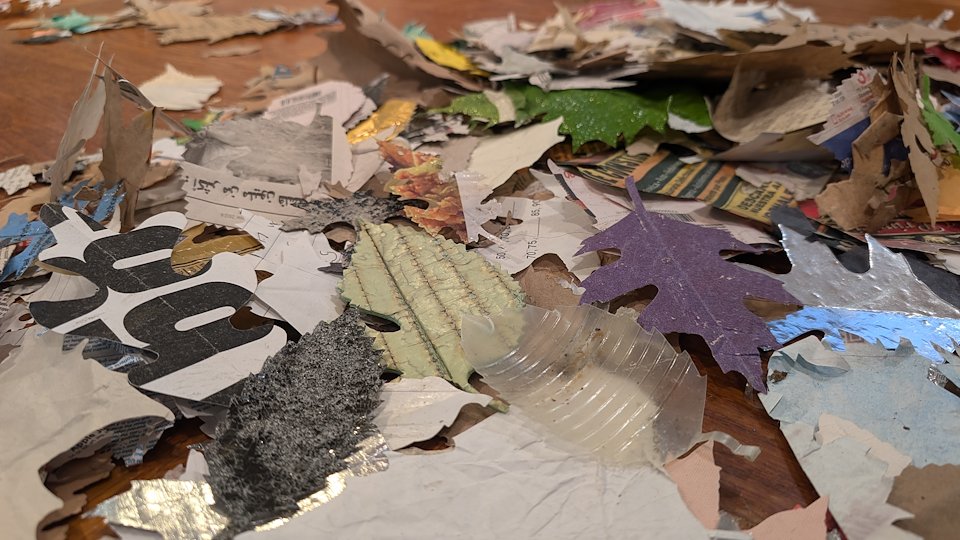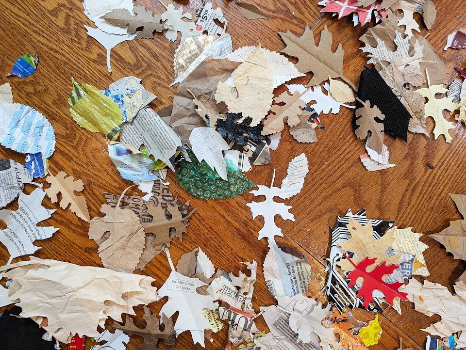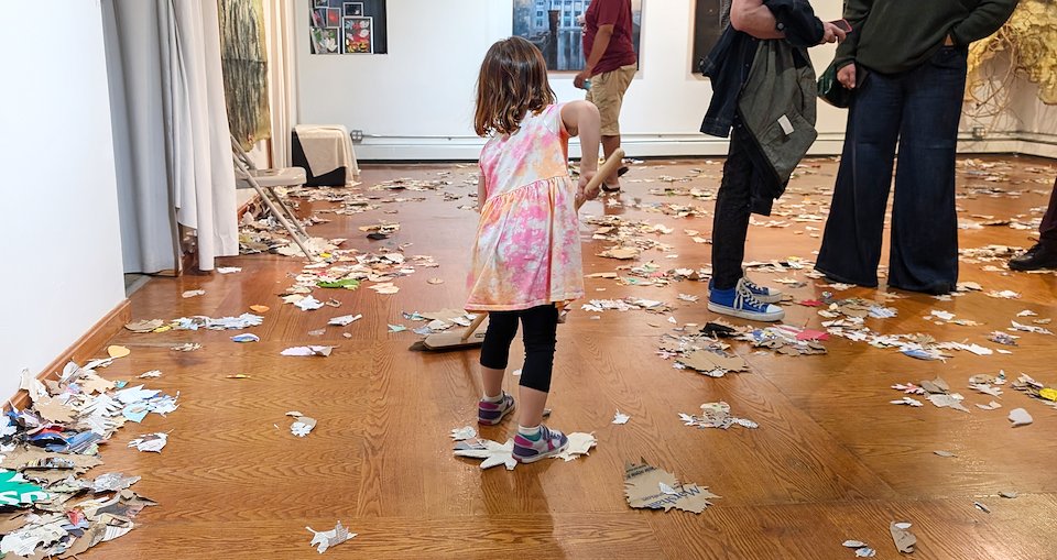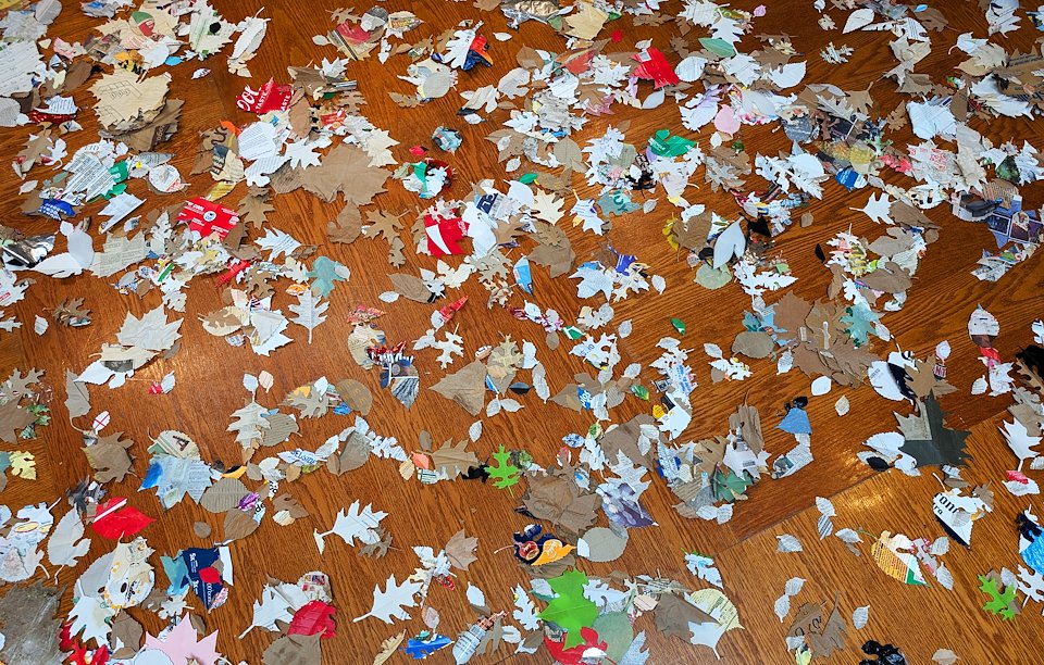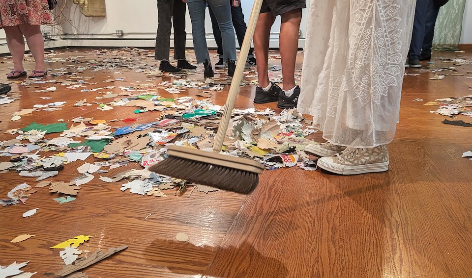 Visitors are invited to sweep the leaves around the gallery floor with two push brooms. Walking around the room leads one to discover and delight in the varied different textures, details, and provenances of the cut leaves. They are made from lotto tickets, newspapers, bubble wrap, cardboard, homework, caution tape, food packaging, and more.